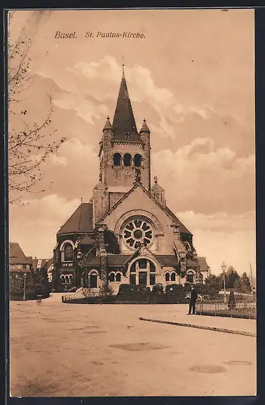 AK Basel, St. Paulus-Kirche mit Strassenpartie