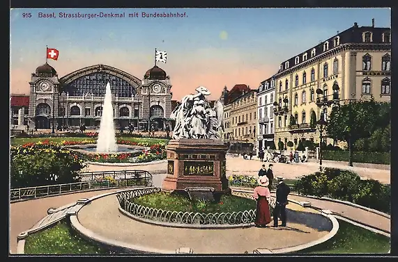 AK Basel, Strassburger-Denkmal mit Bundesbahnhof