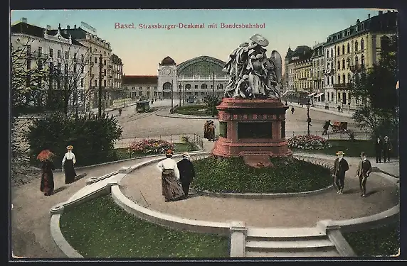 AK Basel, Strassburger-Denkmal mit Bundesbahnhof