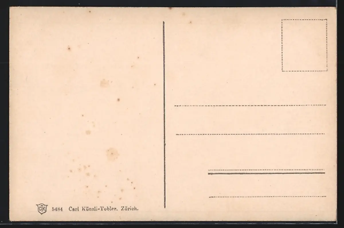 Personenbezogene Daten auf der Rückseite der Karte wurden durch blauen Textmarker unkenntlich gemacht. Die blauen Stellen sind auf die Vorderseite durchgeweicht und wirken sich negativ auf das Postkartenfoto aus