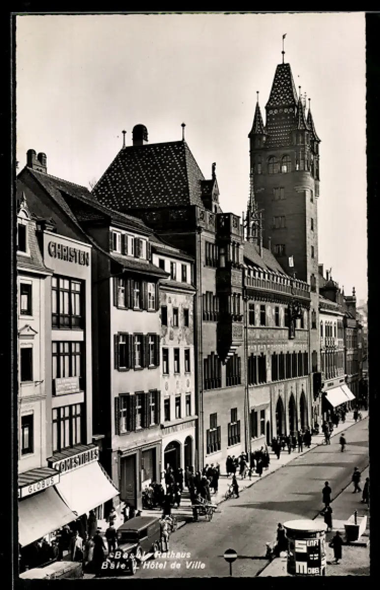 AK Basel, Strassenpartie mit Geschäften und Rathaus