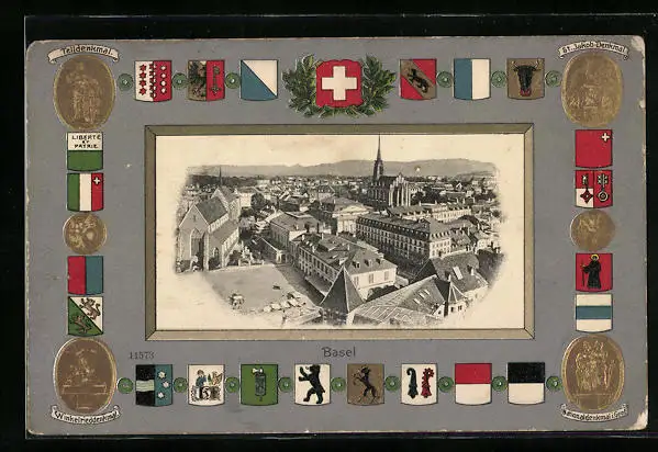 AK Basel, Teilansicht mit Kirche, Telldenkmal, Winkelrieddenkmal, St. Jakob-Denkmal, Passepartout