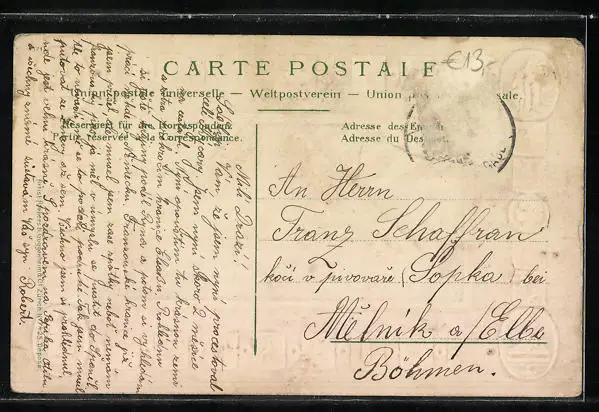 alte Ansichtskarte, gelaufen, Briefmarke tw. entfernt, rückseitig Oberflächenschaden, Bugspuren li. oben u. unten, Oberflächenschaden, guter Zustand