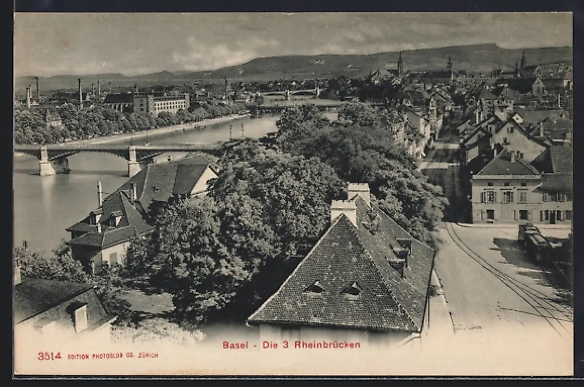 AK Basel, Teilansicht mit den 3 Rheinbrücken