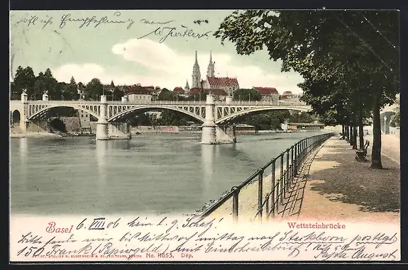 AK Basel, Uferpartie an der Wettsteinbrücke
