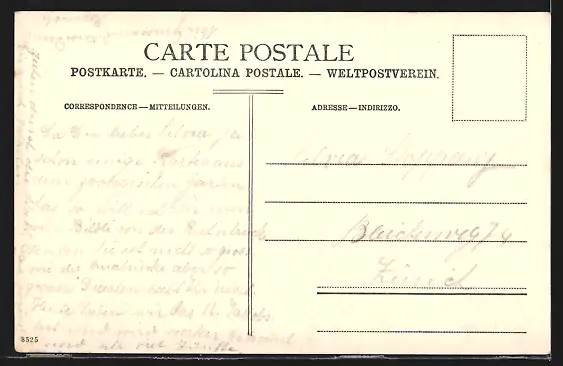 Personenbezogene Daten auf der Rückseite der Karte wurden durch blauen Textmarker unkenntlich gemacht. Die blauen Stellen sind auf die Vorderseite durchgeweicht und wirken sich negativ auf das Postkartenfoto aus