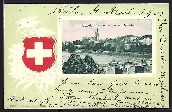 AK Basel, alte Rheinbrücke mit Strassenbahn, geprägtes Wappen