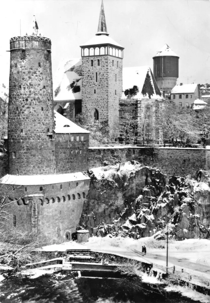 Ansichtskarte Bautzen winterliche Teilansicht, Version 3 Alte Wasserkunst und Michaeliskirche rückseitige Beschreibungstexte in Deutsch und Sorbisch Erhaltung II, an den Ecken leichte Einprägungen von Albumlagerung postalisch gelaufen, gestempelt: Bautzen, unleserlich Druckvermerk: 1979 Herstellungsland: DDR Verlag: Bild und Heimat, Reichenbach i. V. - 01 12 01 221