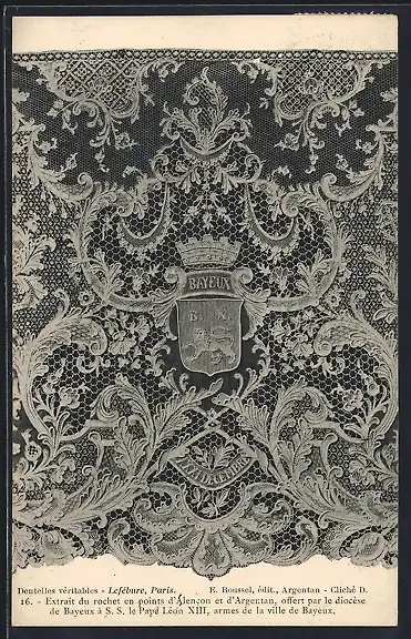 AK Bayeux, Extrait du rochet en points d`Alencon et d`Argentan, Klöppelarbeit mit Wappen