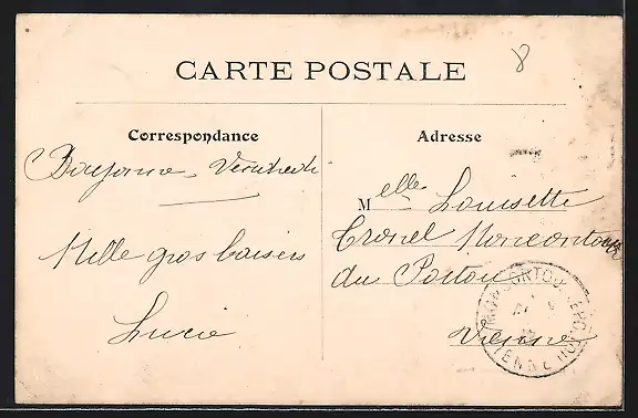 Personenbezogene Daten auf der Rückseite der Karte wurden durch blauen Textmarker unkenntlich gemacht. Die blauen Stellen sind auf die Vorderseite durchgeweicht und wirken sich negativ auf das Postkartenfoto aus