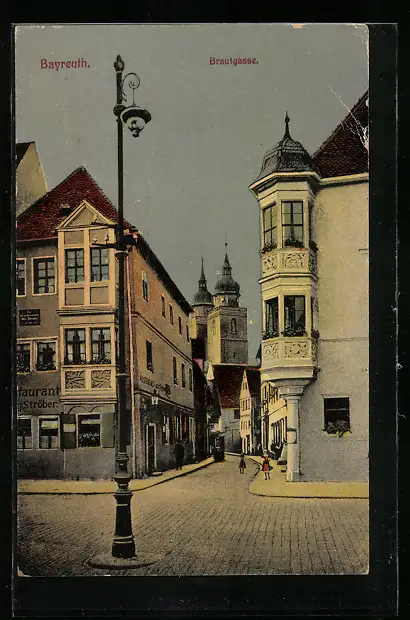 AK Bayreuth, Brautgasse mit Restaurant Ströber und Kirche