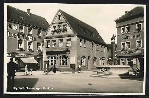 AK Bayreuth, Chevauleger Denkmal mit Gasthaus Chr. Grampp mit Passanten
