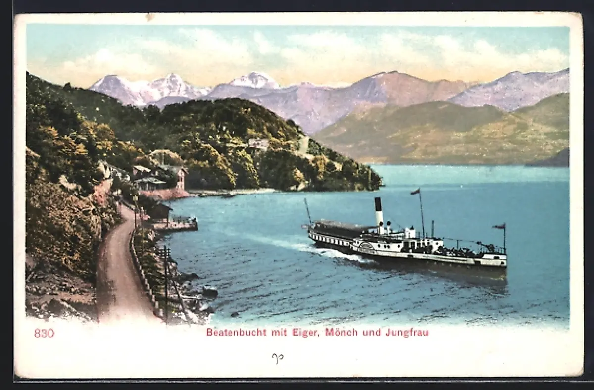 AK Beatenberg, Beatenbucht, Ansicht mit Dampfer, Eiger, Mönch und Jungfrau