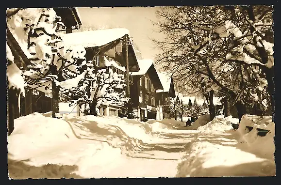 AK Beatenberg, Verschneite Dorfpartie mit Rodlern