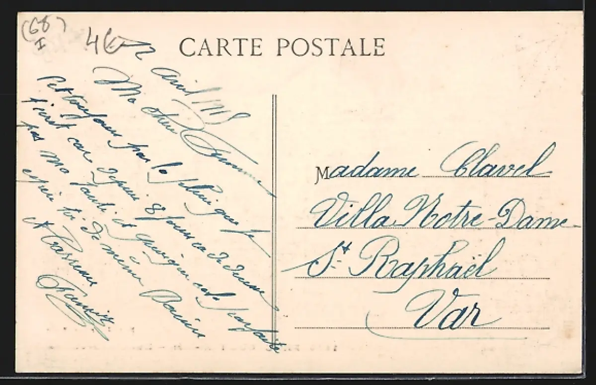 Personenbezogene Daten auf der Rückseite der Karte wurden durch blauen Textmarker unkenntlich gemacht. Die blauen Stellen sind auf die Vorderseite durchgeweicht und wirken sich negativ auf das Postkartenfoto aus