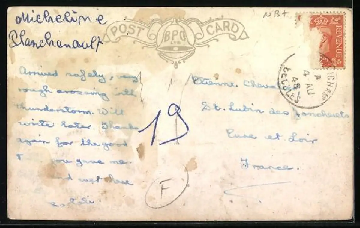 gelaufen 1948, Briefmarke entfernt, Abriebspur re. oben, guter Zustand