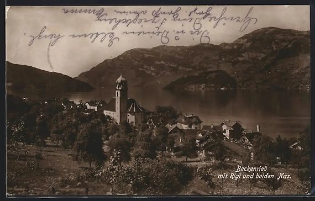AK Beckenried, Teilansicht mit Kirche, Rigi und beiden Nas