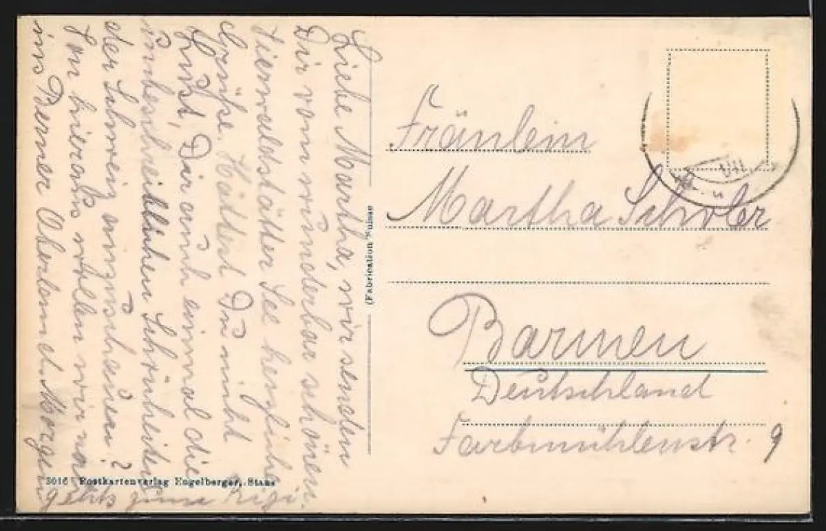 Personenbezogene Daten auf der Rückseite der Karte wurden durch blauen Textmarker unkenntlich gemacht. Die blauen Stellen sind auf die Vorderseite durchgeweicht und wirken sich negativ auf das Postkartenfoto aus
