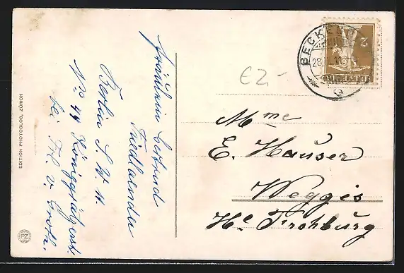 Personenbezogene Daten auf der Rückseite der Karte wurden durch blauen Textmarker unkenntlich gemacht. Die blauen Stellen sind auf die Vorderseite durchgeweicht und wirken sich negativ auf das Postkartenfoto aus