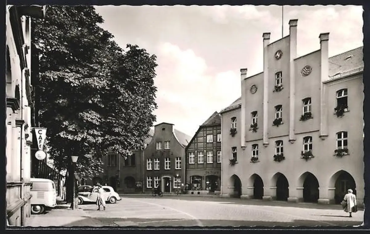 AK Beckum /Westf., Markt mit Rathaus u. Geschäft Th. Thopp u. Ratsklause