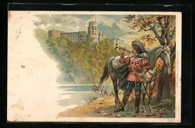 AK Behüt Dich Gott!, Trompeter mit Pferd am Ufer