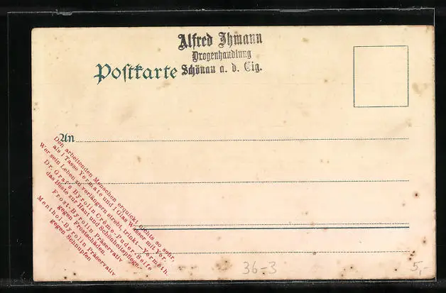 Personenbezogene Daten auf der Rückseite der Karte wurden durch blauen Textmarker unkenntlich gemacht. Die blauen Stellen sind auf die Vorderseite durchgeweicht und wirken sich negativ auf das Postkartenfoto aus