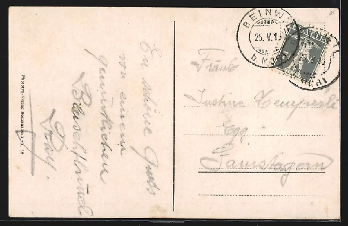 Personenbezogene Daten auf der Rückseite der Karte wurden durch blauen Textmarker unkenntlich gemacht. Die blauen Stellen sind auf die Vorderseite durchgeweicht und wirken sich negativ auf das Postkartenfoto aus