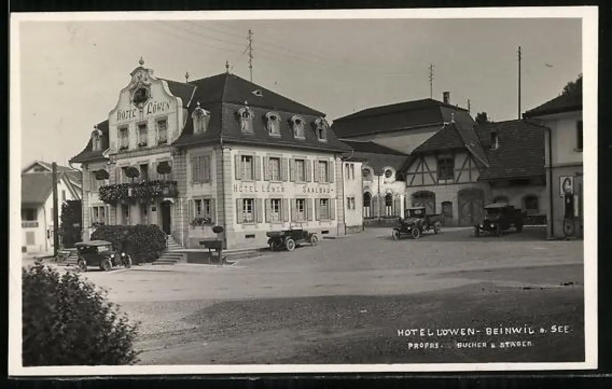 AK Beinwil a. See, Hotel Löwen, Proprs. Bucher & Stäger, parkende Autos