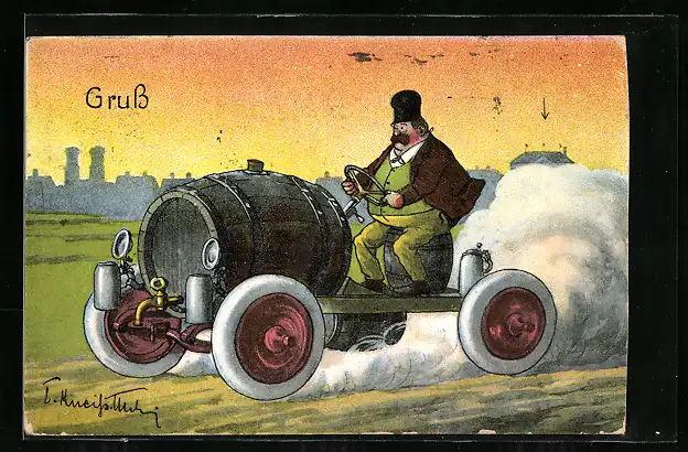 AK Beleibter Herr im Auto mit Bierfass als Motor
