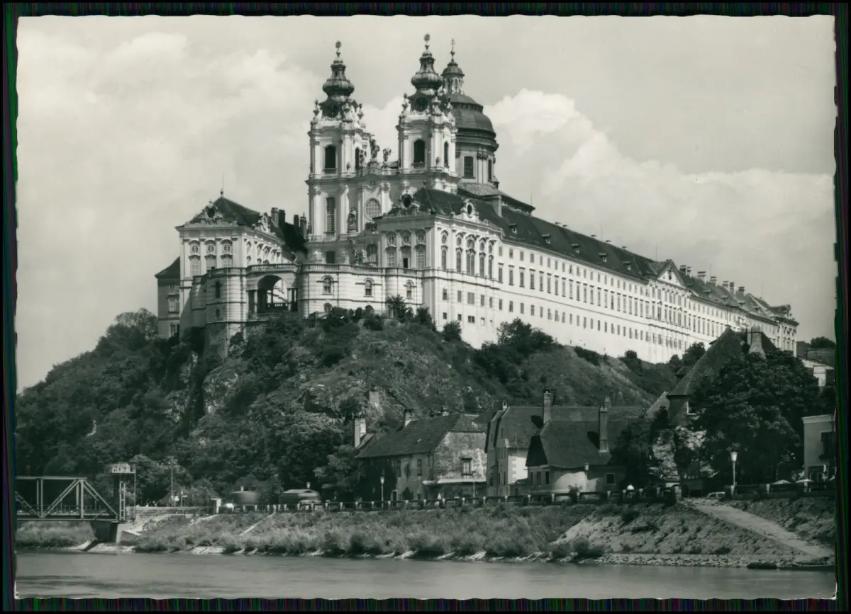 Motiv: Schwarzweiß-Aufnahme des eindrucksvollen Stifts Melk, mit kompletter Ansicht des barocken Baukomplexes auf dem Felsen oberhalb der Donau, im Vordergrund Altstadt und Uferstraße. Deutlich erkennbar: die prächtigen Doppeltürme und die monumentale Fassade des Stifts.