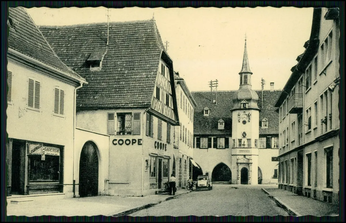 Motiv: Blick in die Rue du Général de Gaulle mit dem markanten Stadttor und den typischen elsässischen Fachwerkhäusern. Links im Bild das Geschäft COOPE, rechts gut erkennbar die historische Bebauung des alten Stadtkerns.