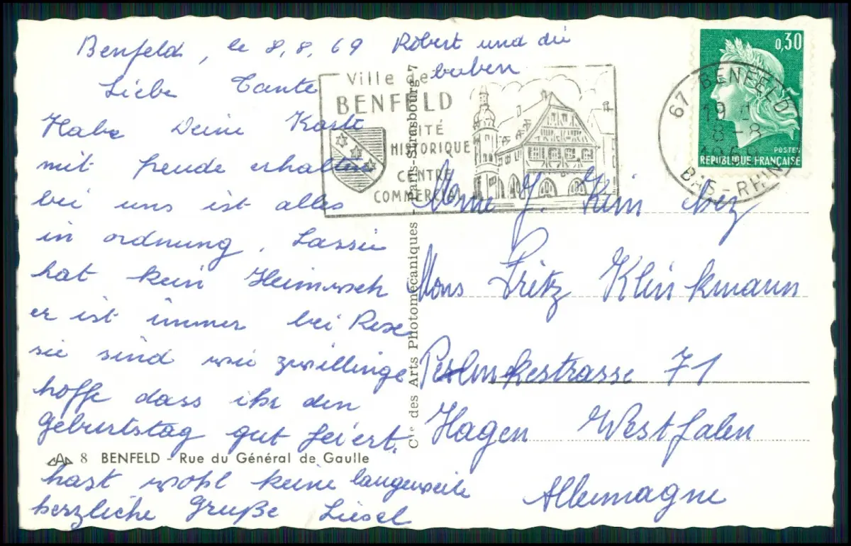 Rückseite: Gelaufen 1969 mit Briefmarke République Française 0,30 Fr und Poststempel Benfeld 67. Handschriftlich beschriebene Karte mit Grußtext.
