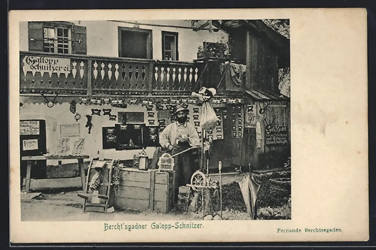 AK Berchtesgaden, Galopp-Schnitzer in seiner Werkstatt
