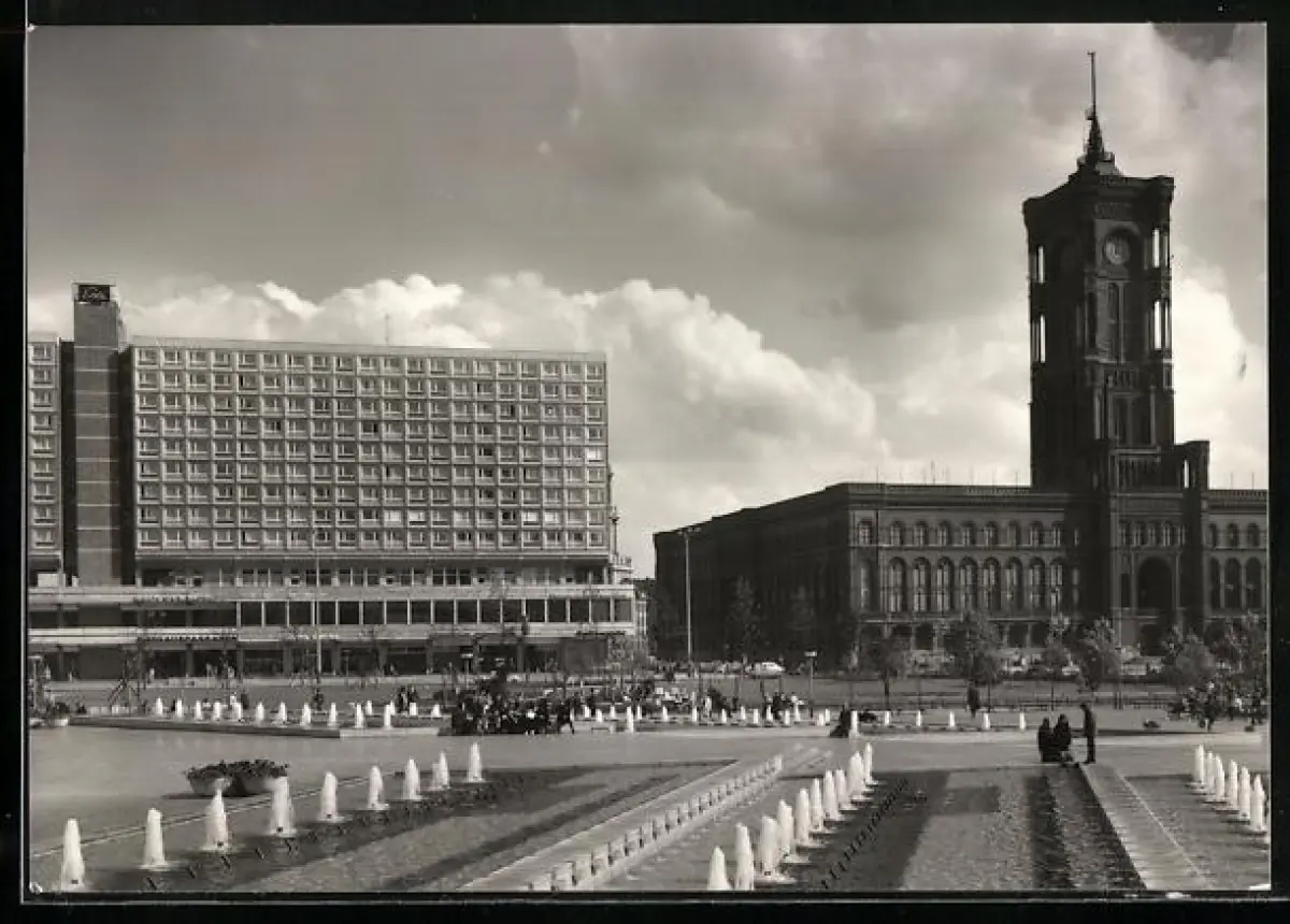 AK Berlin, Alexanderplatz, Springbrunnen-Anlage mit Haus der Mode u. Rathaus