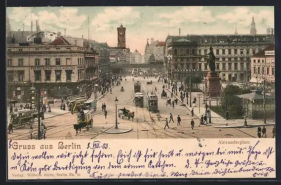 AK Berlin, Alexanderplatz, Strassenpartie mit Denkmal und Strassenbahnen