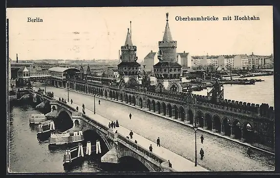 AK Berlin-Friedrichshain, Oberbaumbrücke mit Hochbahn
