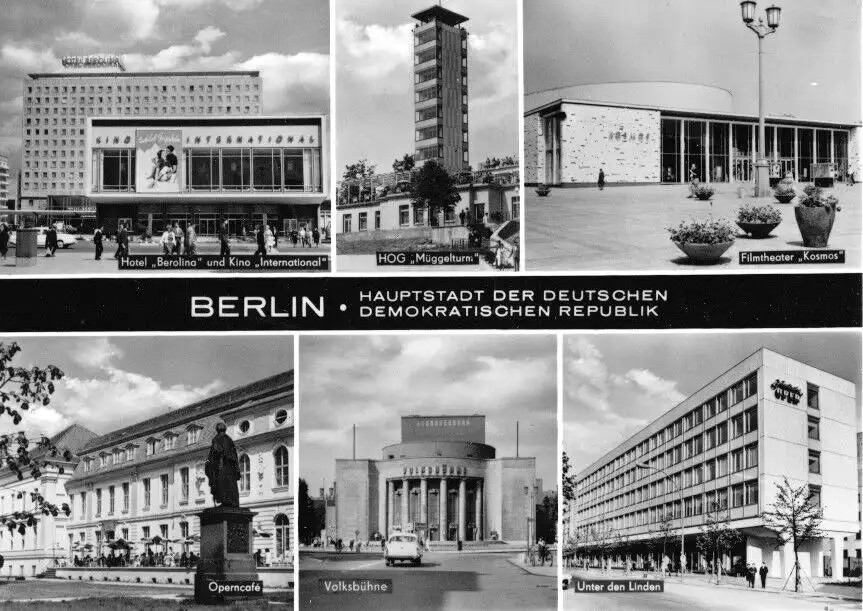 Ansichtskarte Berlin, Hauptstadt der DDR sechs Abb., gestaltet Interhotel Berolina und Kino "International", HOG "Müggelturm", Filmtheater "Kosmos", Operncafé, Volksbühne, Unter den Linden Erhaltung I-II ungelaufen Druckvermerk: 1969 Herstellungsland: DDR Verlag: VEB Bild und Heimat, Reichenbach i. V. - 15/1257