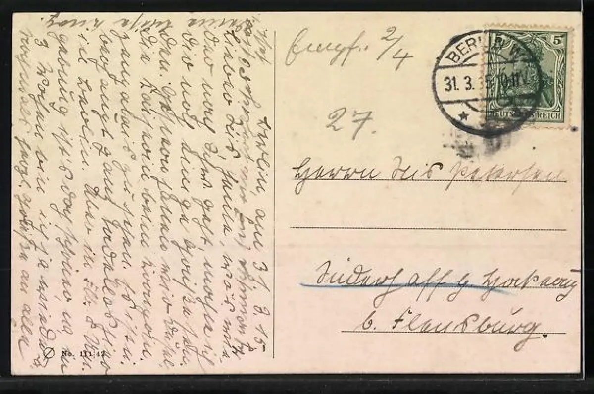 Personenbezogene Daten auf der Rückseite der Karte wurden durch blauen Textmarker unkenntlich gemacht. Die blauen Stellen sind auf die Vorderseite durchgeweicht und wirken sich negativ auf das Postkartenfoto aus