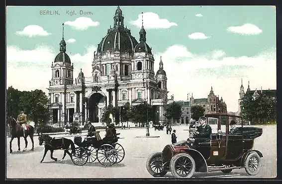 AK Berlin, Kgl. Dom, Auto, Kutsche, Reiter