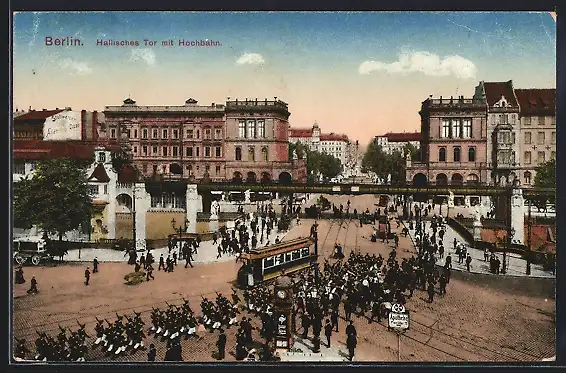 AK Berlin-Kreuzberg, marschierende Soldaten am Halleschen Tor, Strassenbahn