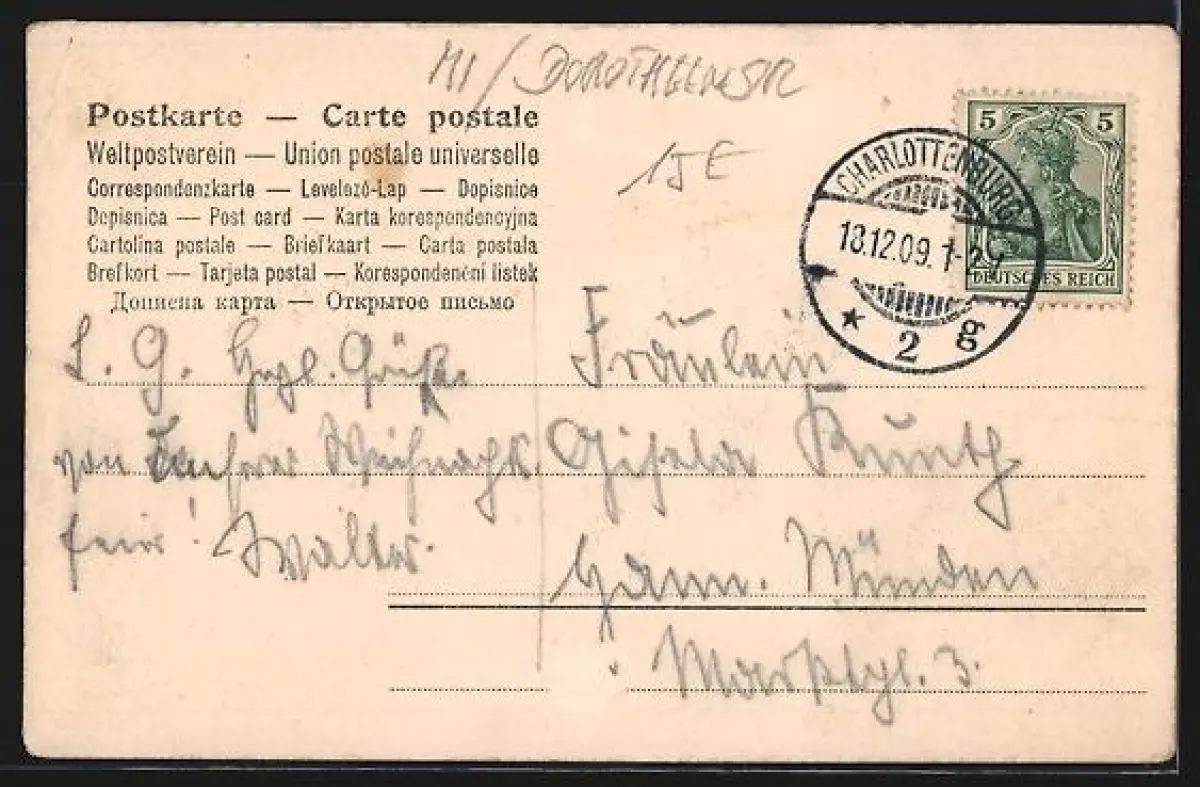 gelaufen 1909, Eckknick rechts oben, guter Zustand