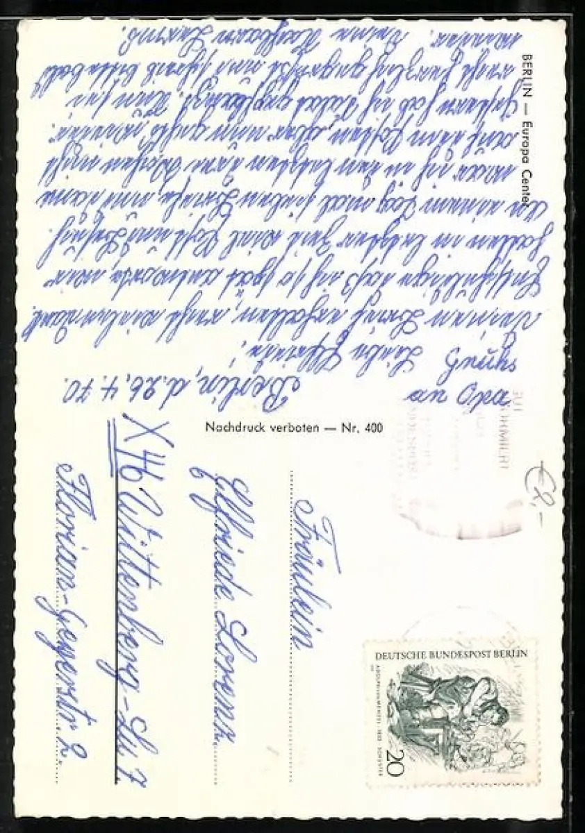 Personenbezogene Daten auf der Rückseite der Karte wurden durch blauen Textmarker unkenntlich gemacht. Die blauen Stellen sind auf die Vorderseite durchgeweicht und wirken sich negativ auf das Postkartenfoto aus
