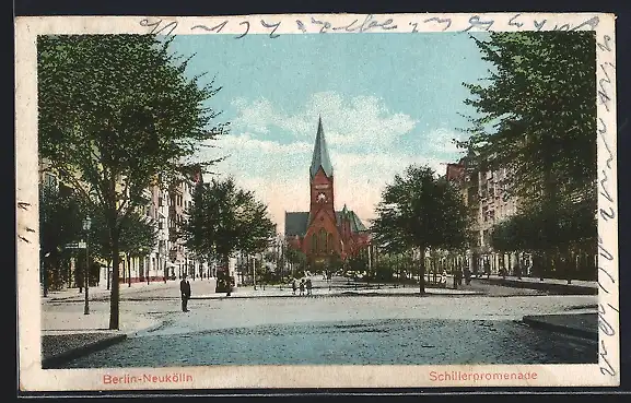 AK Berlin-Neukölln, Blick in die Schillerpromenade in Richtung Kirche
