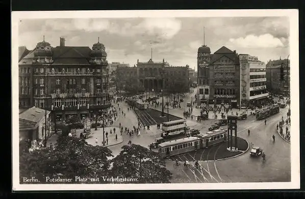AK Berlin, Potsdamer Platz, Strassenbahn am Verkehrsturm