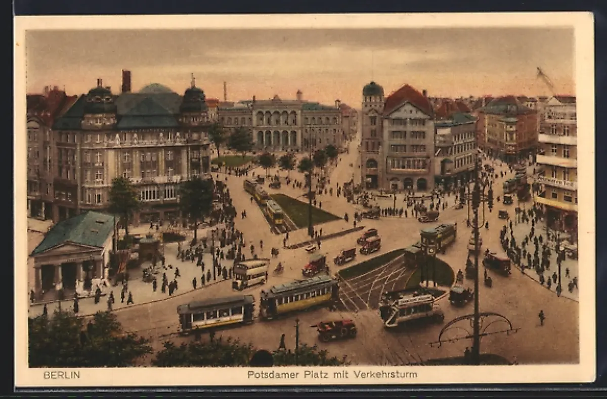 AK Berlin, Potsdamer Platz mit Pelzwarengeschäft Teit, Verkehrsturm und Strassenbahn