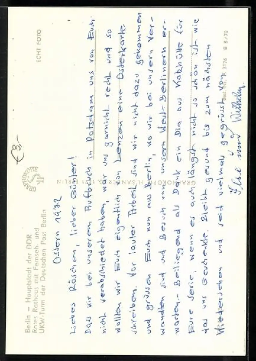 Personenbezogene Daten auf der Rückseite der Karte wurden durch blauen Textmarker unkenntlich gemacht. Die blauen Stellen sind auf die Vorderseite durchgeweicht und wirken sich negativ auf das Postkartenfoto aus