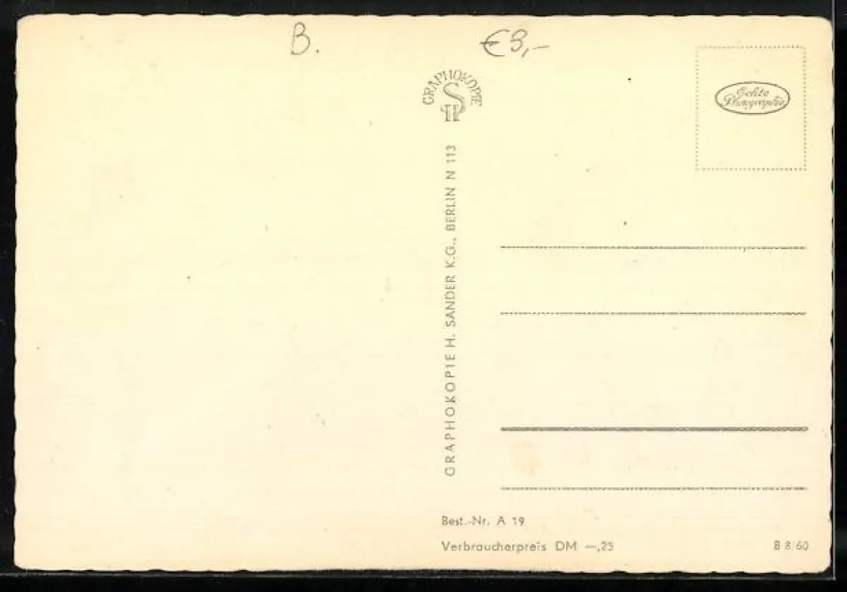 Personenbezogene Daten auf der Rückseite der Karte wurden durch blauen Textmarker unkenntlich gemacht. Die blauen Stellen sind auf die Vorderseite durchgeweicht und wirken sich negativ auf das Postkartenfoto aus