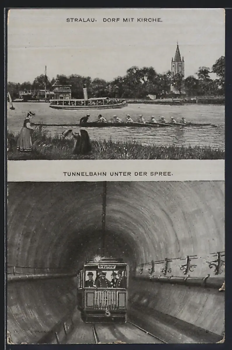 AK Berlin-Stralau, Dorf mit Kirche, Tunnelbahn unter der Spree