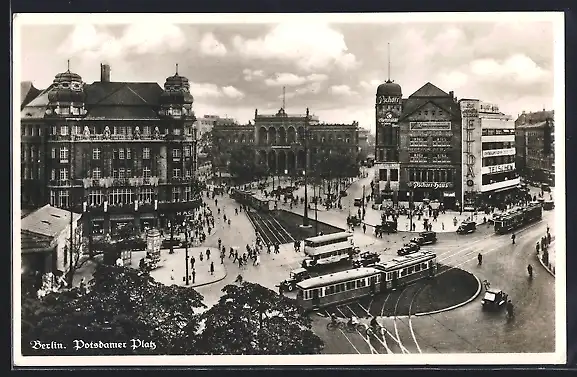 AK Berlin, Strassenbahnen am Potsdamer Platz mit Verkehrsturm