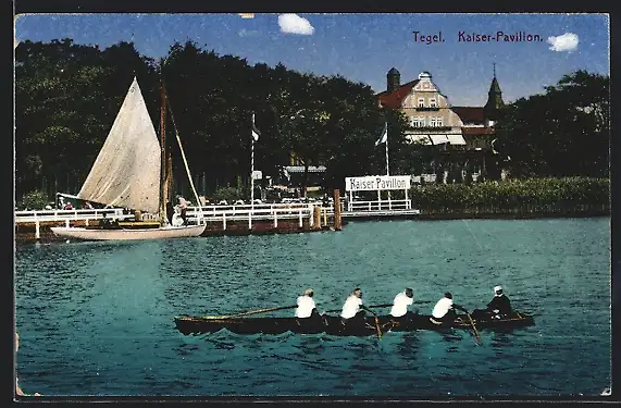 AK Berlin-Tegel, Cafe Kaiser-Pavillon mit Ruderboot
